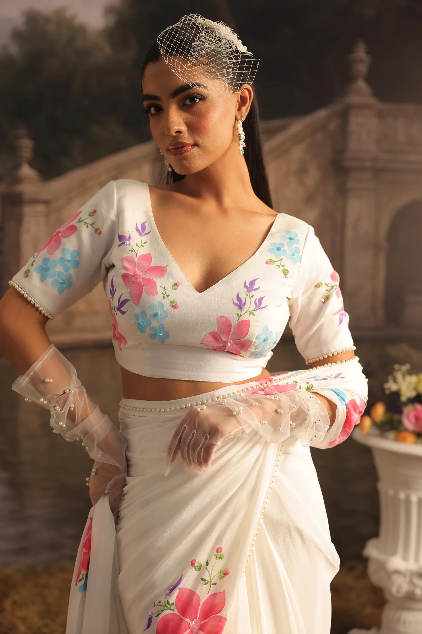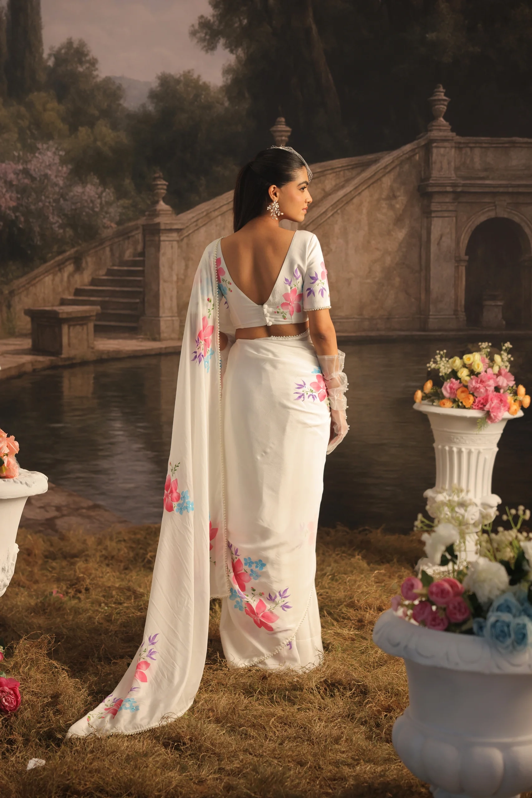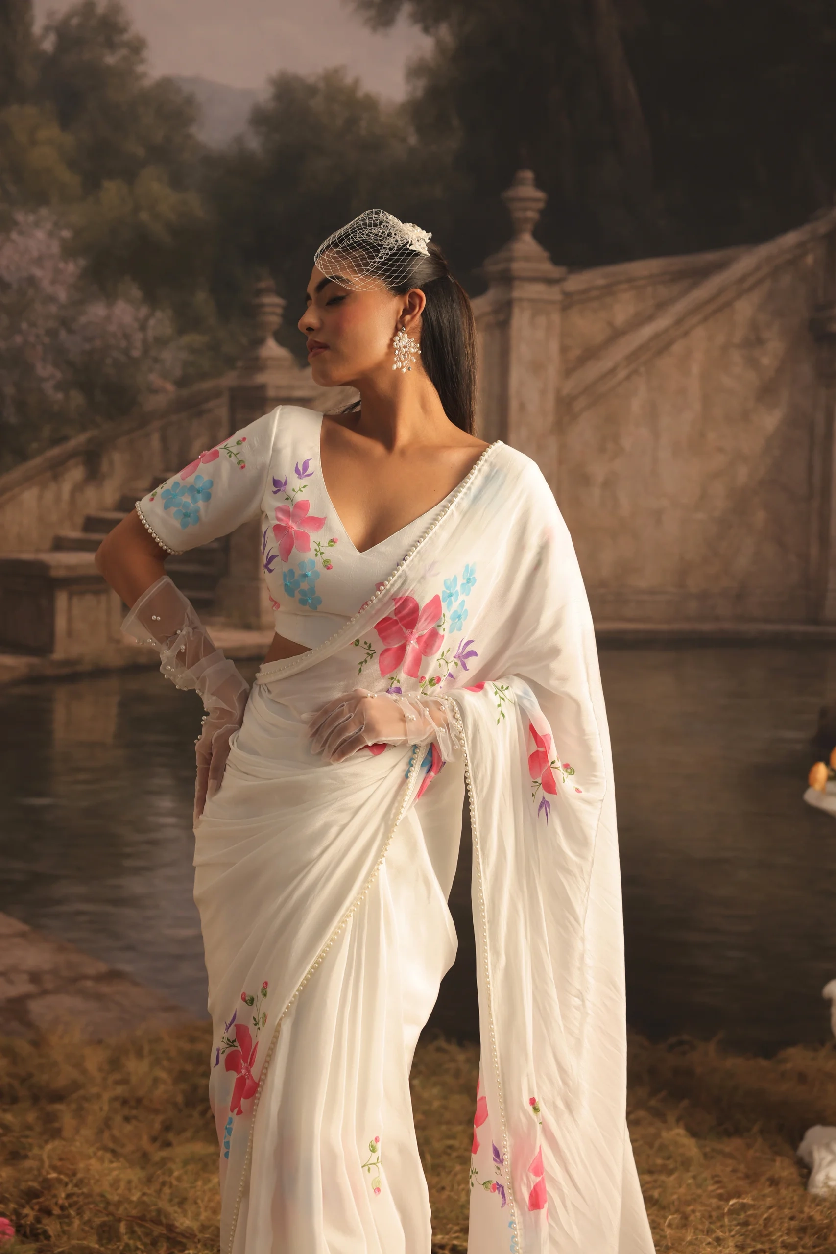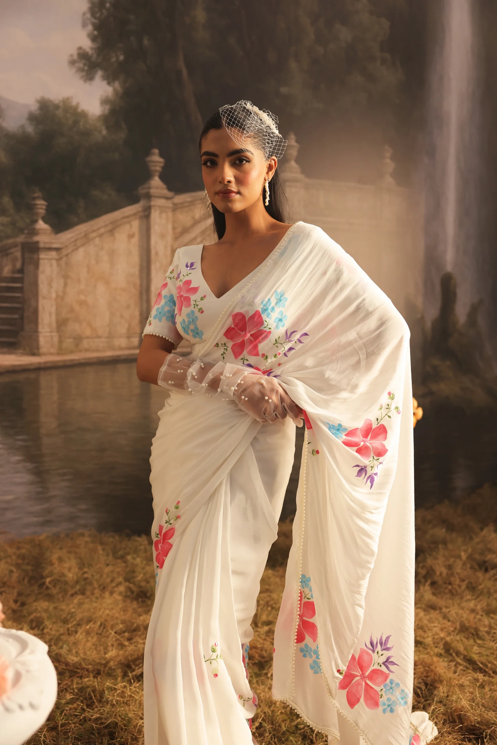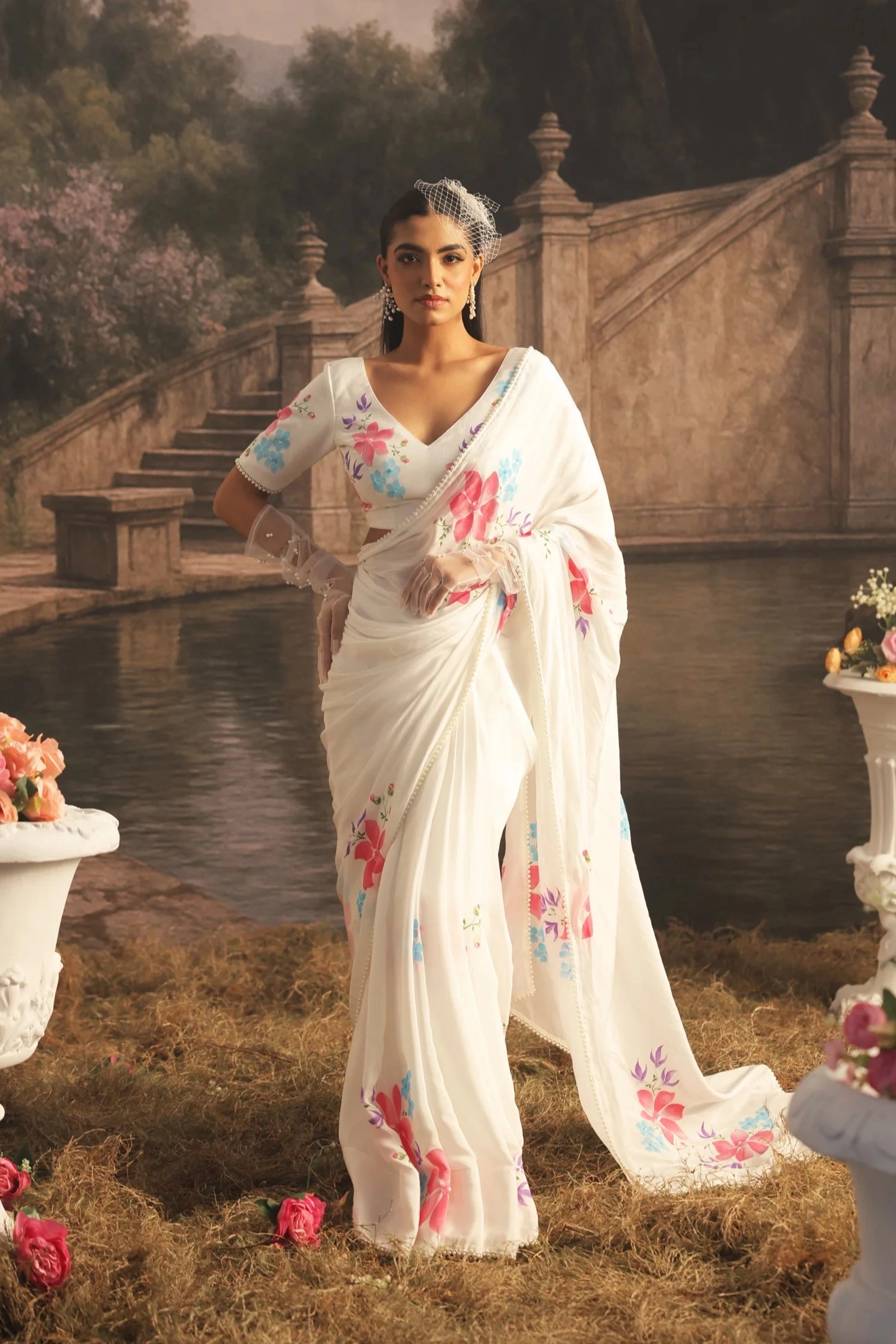 Crafted in crepe, the Alina Saree captures timeless grace through hand-painted florals in vibrant hues of pink, blue, and lilac. The fluid drape features delicate detailing along the borders, paired with a matching hand-painted blouse that enhances its charm. Effortlessly elegant, this piece beautifully blends art and sophistication, perfect for intimate celebrations and special occasions.