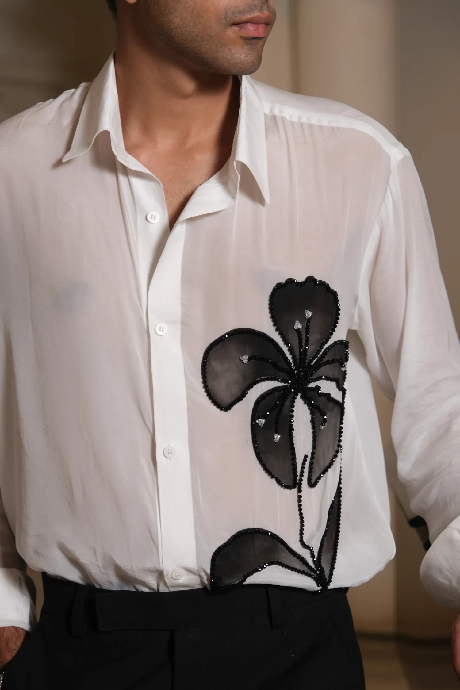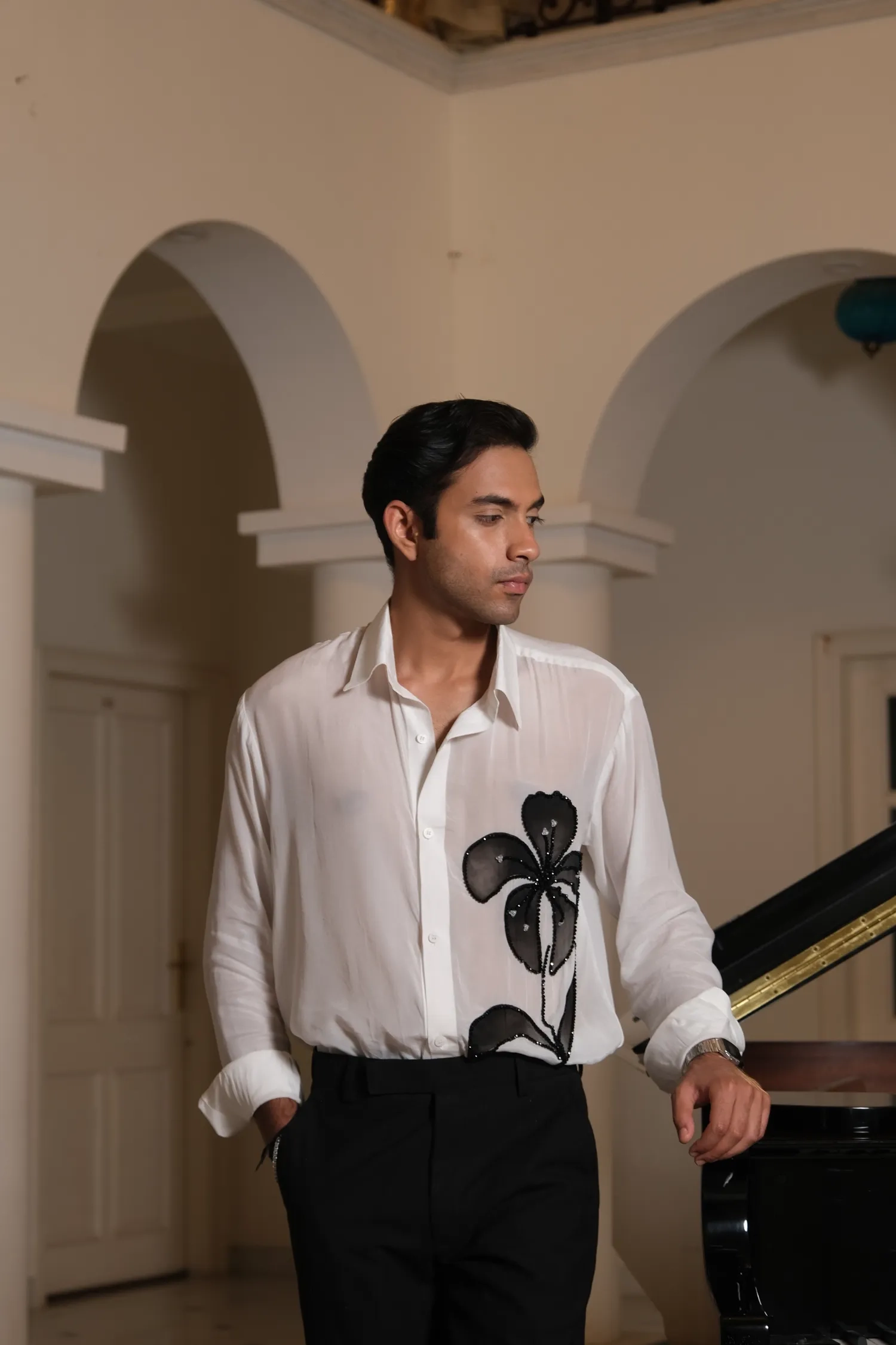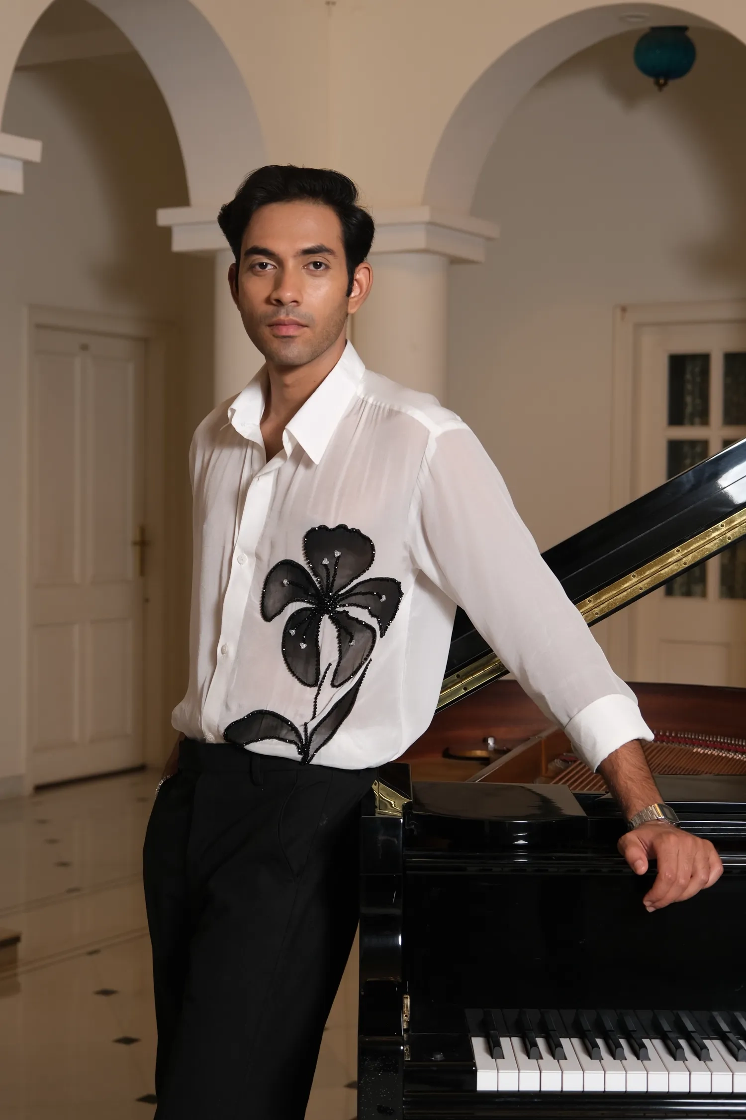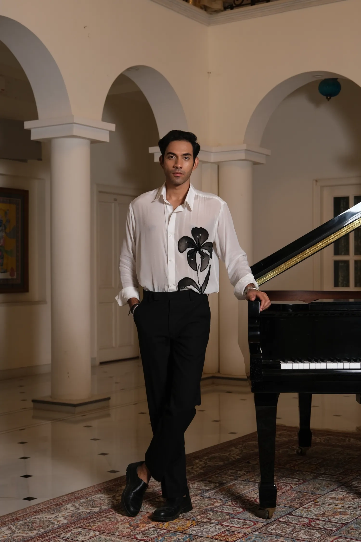 Crafted in crepe, the Zia Shirt is elegance redefined. Featuring a bold hand-painted floral motif enhanced with delicate crystal bead-work, it blends minimalism with a statement edge. Its crisp silhouette and soft drape make it versatile for both festive evenings and refined occasions.