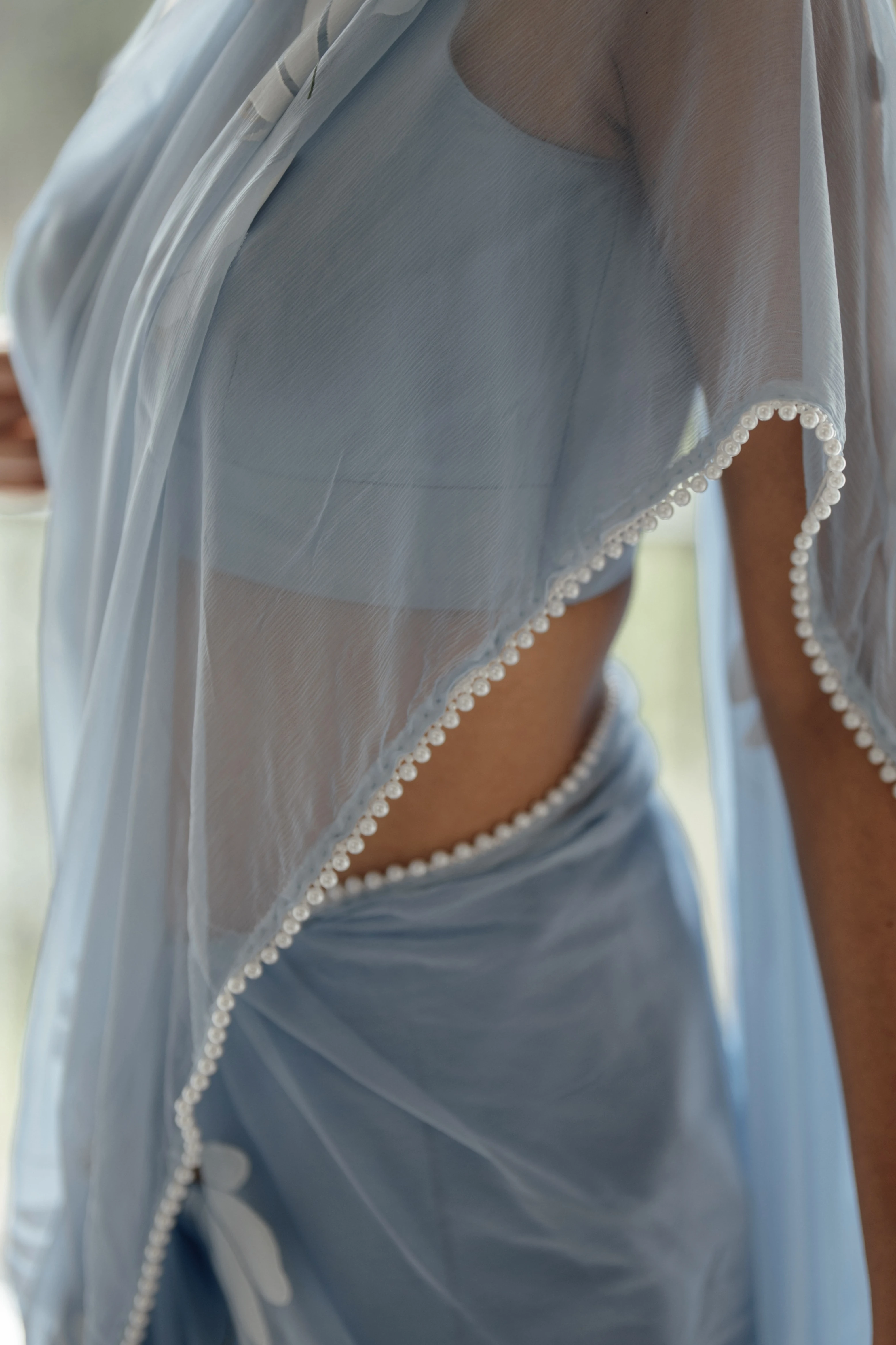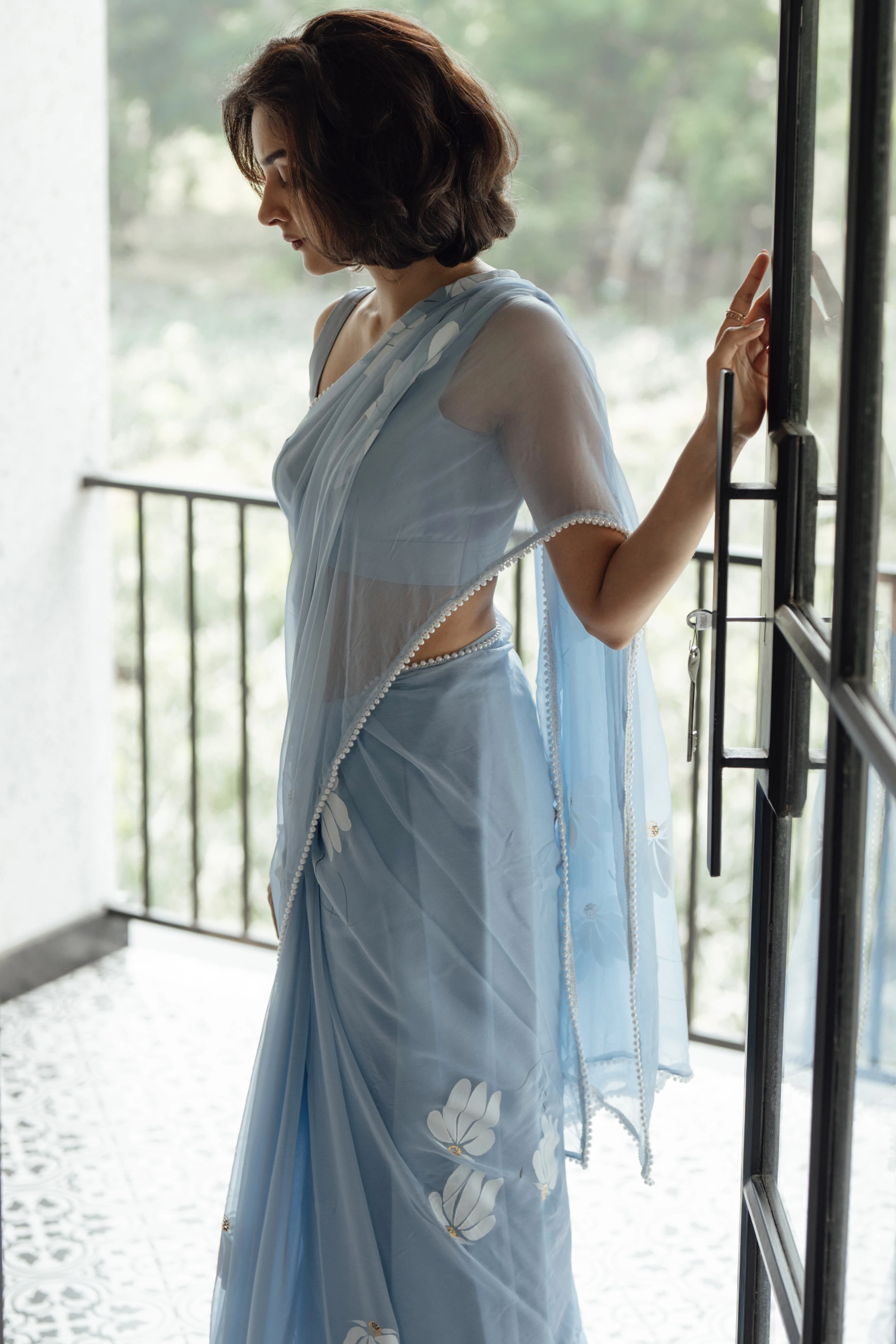 Ash-blue base chiffon saree hand-painted with white half-daisies enhanced with a pearl border.