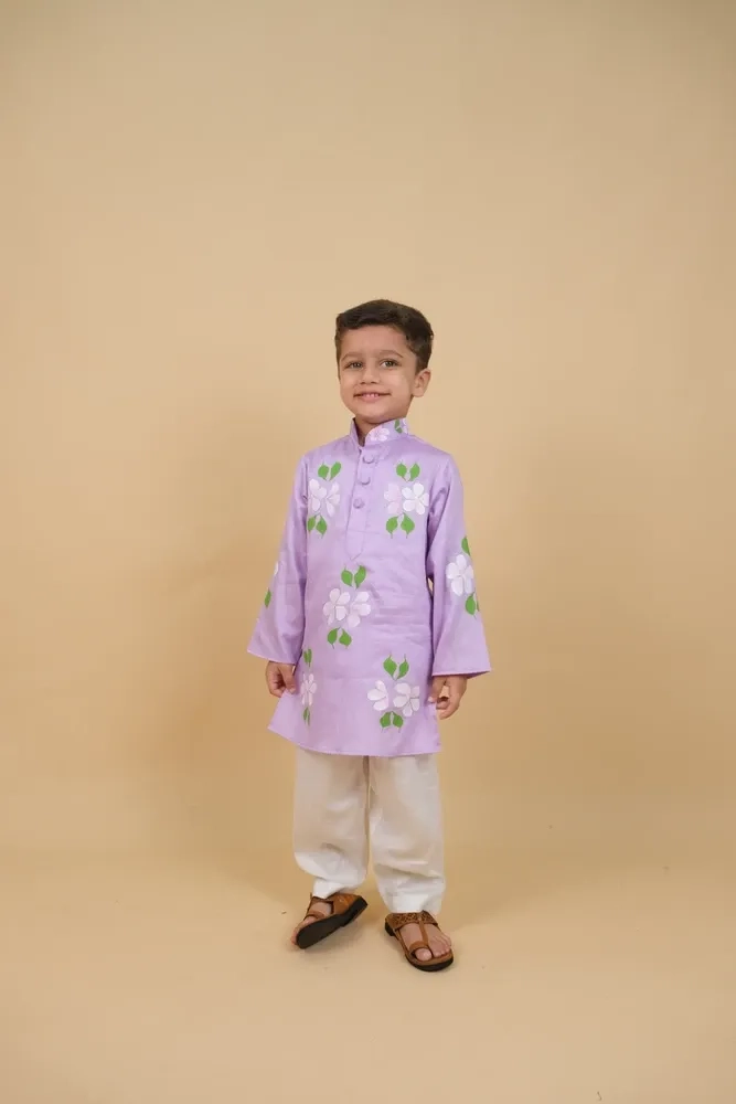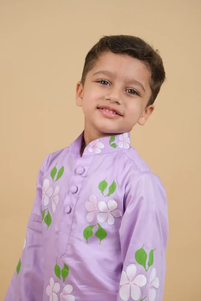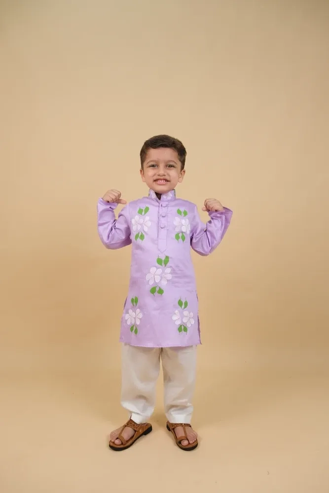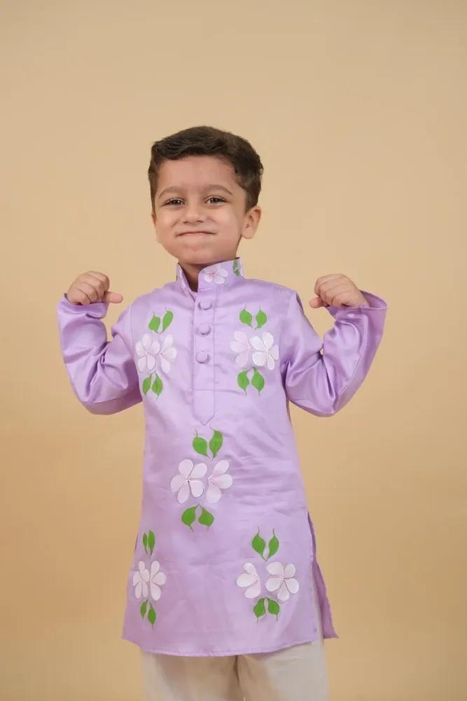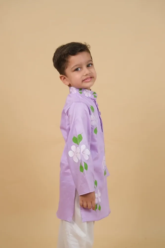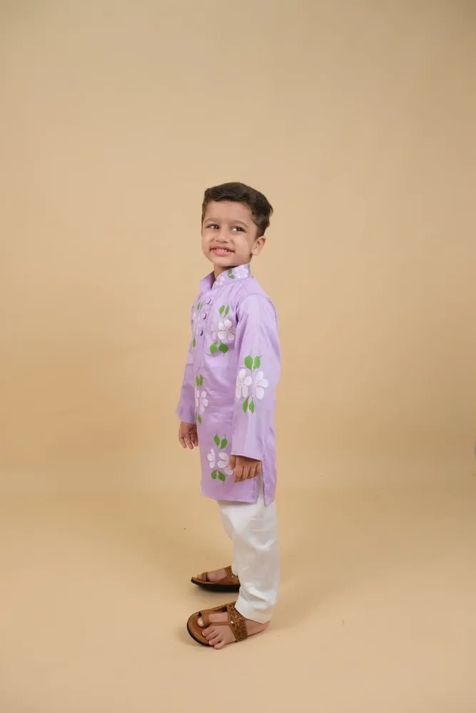 Crafted in soft cotton satin, this lavender kurta is hand-painted with delicate floral motifs in white and green. Comfortable yet festive, it comes paired with a matching pyjama, making it a perfect pick for weddings, celebrations, and traditional occasions.