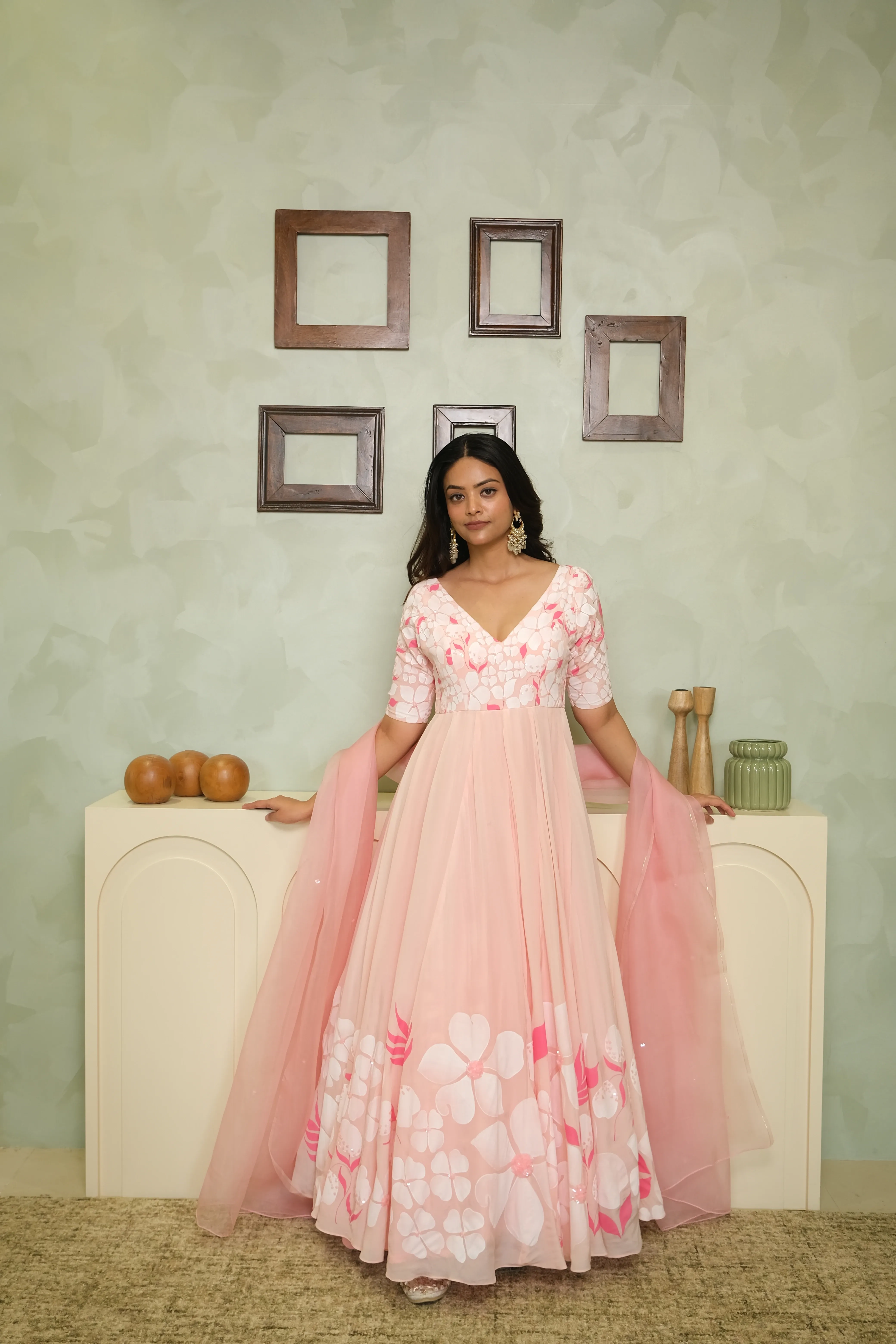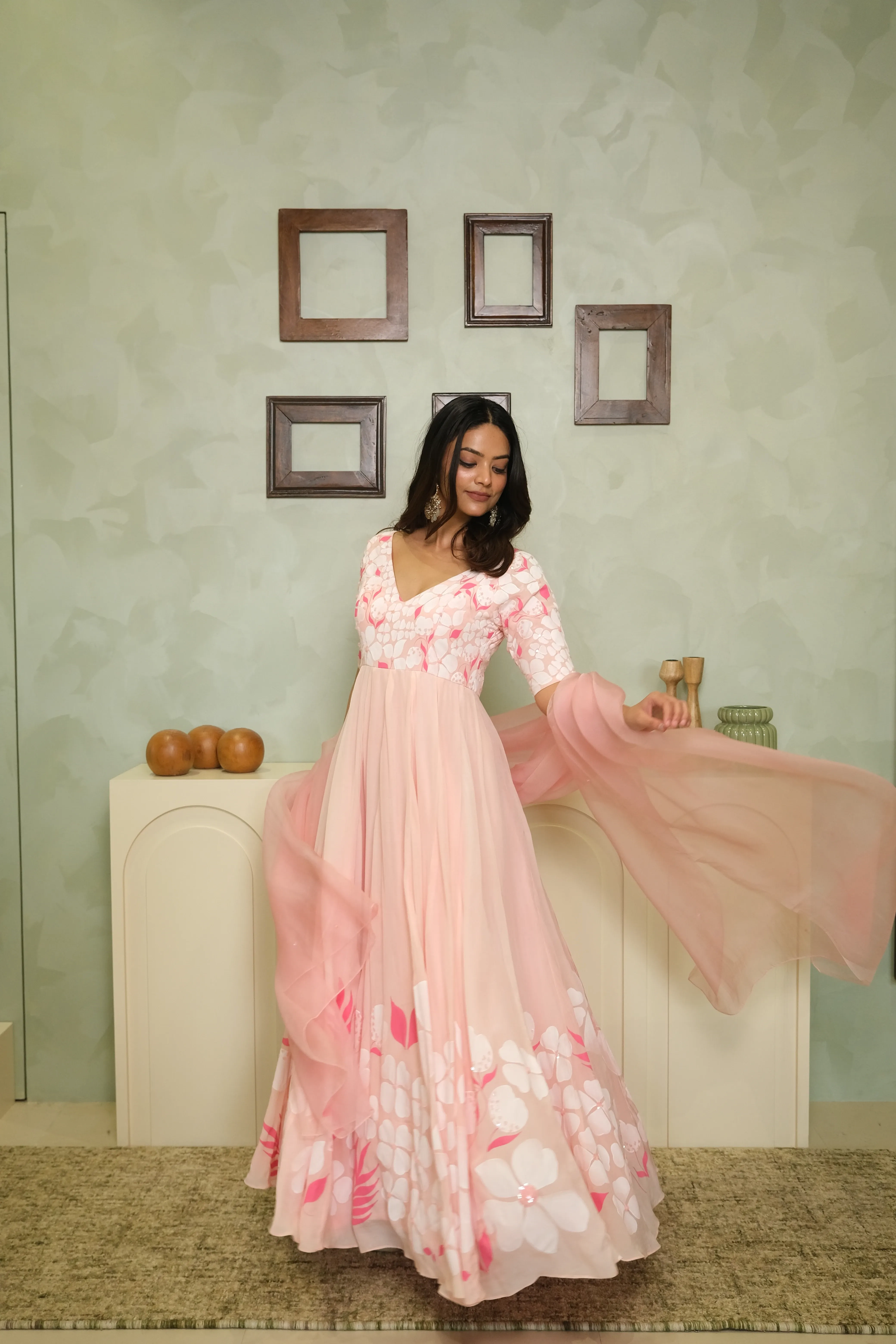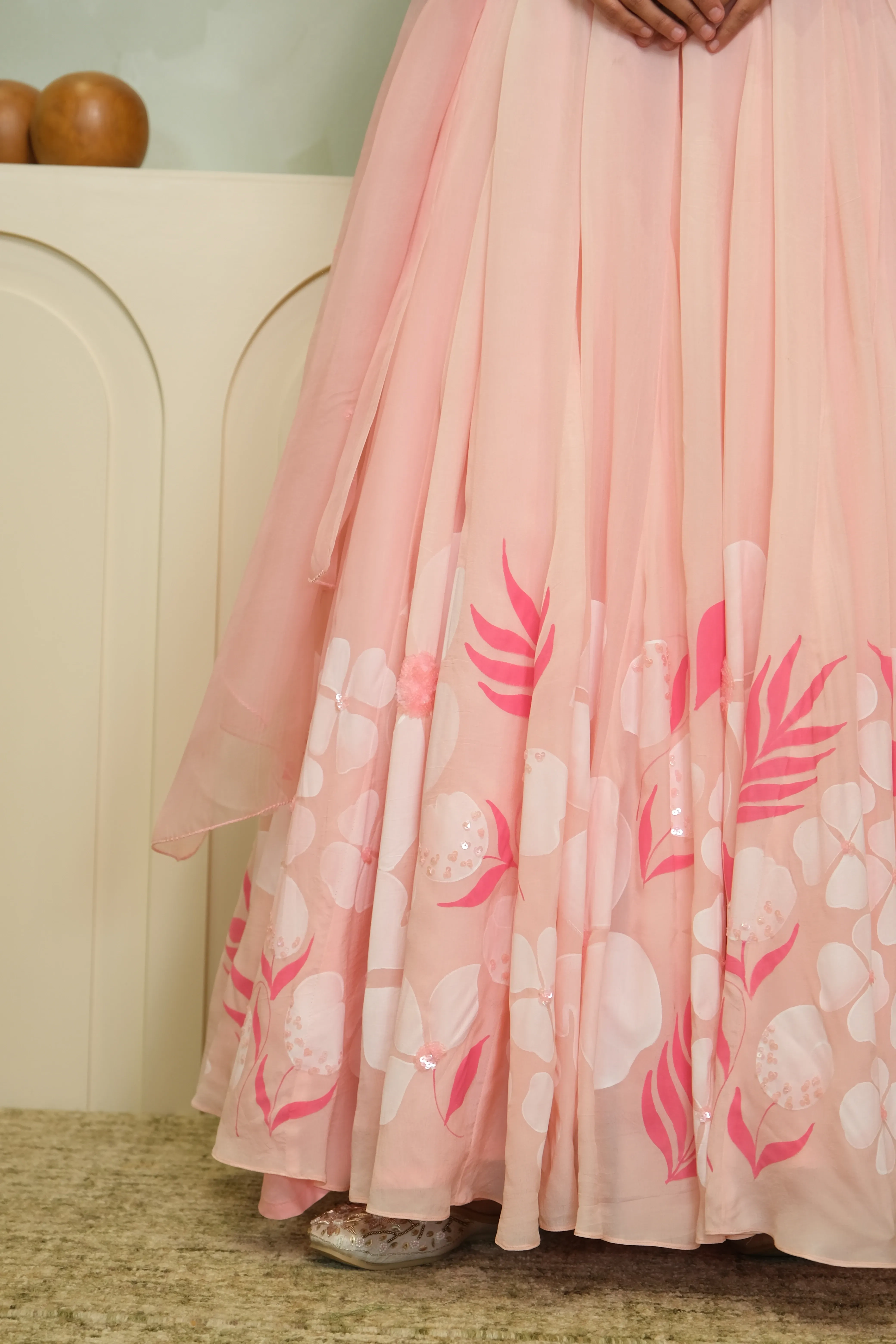 The bodice features delicate hand-painted florals in shades of blush and rose, while the hemline blooms with larger floral motifs that add depth and charm. Subtle embellishments lend a gentle sparkle, enhancing the artistry without overpowering it. Paired with a sheer dupatta that drapes like a dream, this ensemble feels light, airy, and celebration-ready.